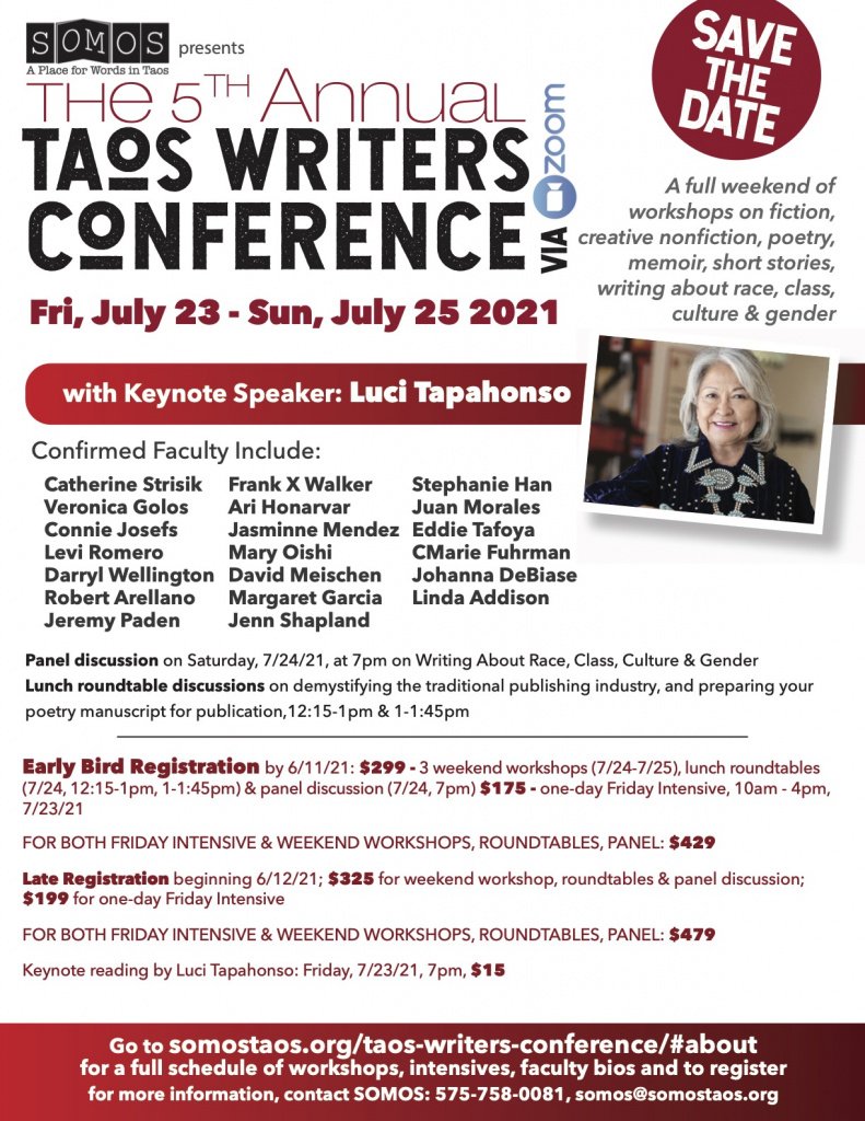 I’ll be teaching at the Taos Writers’ Conference a workshop on Identity and Voice: The Narrative of Group and Self on July 25, 2021. This workshop will cover both the