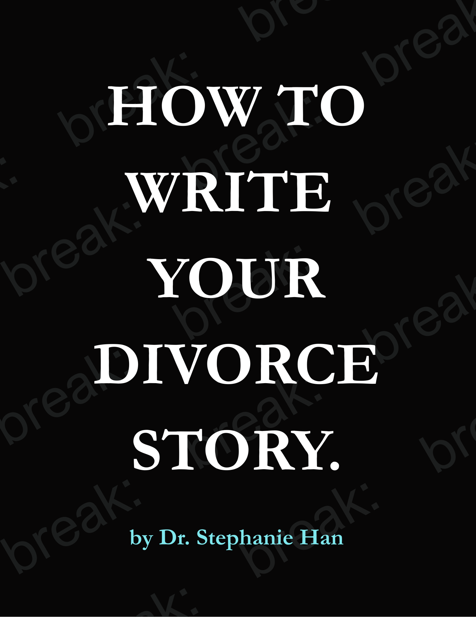 Dr. Stephanie Han’s BREAK: How to Write Your Divorce Story offers sincere and steady clarity from an informed voice. It was a valuable companion on my journey to critically, justly, and compassionately (compassion for myself and for others) process my own break from my husband and look toward my future. The step-by-step guide is accessible, thought-provoking, and covers the spectrum of topics that need to be considered in this process. There is no other resource like this out there. I highly recommend it for anyone on the path to reclaiming and re-storying their lives.